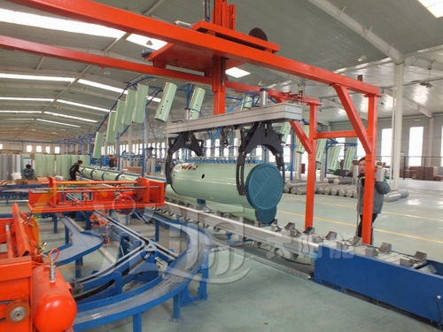 該生產(chǎn)線水箱發(fā)泡采用臥式無(wú)氟高壓定量一次發(fā)泡工藝,是國(guó)內(nèi)第一家,也是目前國(guó)內(nèi)最先進(jìn)的發(fā)泡線;內(nèi)外桶組裝完成后由機(jī)械手自動(dòng)抓取,放到工藝小車上,發(fā)泡完成后也由機(jī)械手來(lái)完成水箱的下件工作,減輕了工人的勞動(dòng)強(qiáng)度,減少了搬運(yùn)過(guò)程中的磕碰等現(xiàn)象;發(fā)泡完成后水箱由錐滾線和升降機(jī)自動(dòng)運(yùn)送到地下室,屬首家采用地下室恒溫保溫工藝,節(jié)約能源,保證生產(chǎn)出的水箱具有穩(wěn)定的質(zhì)量。