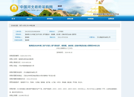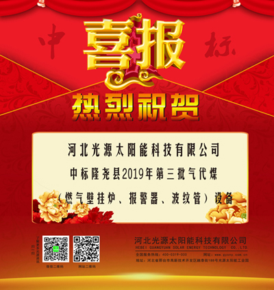 捷報頻傳, 熱烈祝賀我公司(河北光源太陽能科技有限公司)2019年08月22日中標隆堯縣2019年第三批氣代煤(燃氣壁掛爐、報警器、波紋管)設(shè)備采購及安裝入圍項目。本次中標又一次認可了我公司的產(chǎn)品質(zhì)量,驗證了我公司的實力。