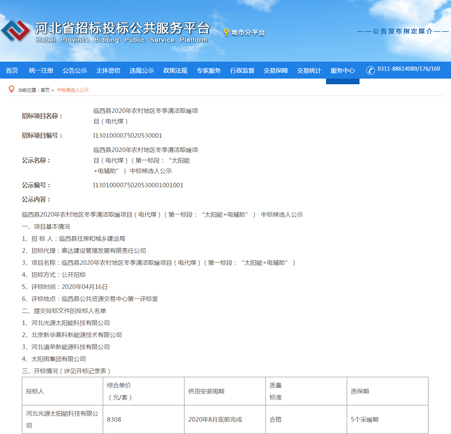 2020年,一場(chǎng)突如其來(lái)的疫情席卷全國(guó),蔓延全球。隔離疫情不隔離服務(wù),在此特殊時(shí)期,光源公司積極踐行企業(yè)社會(huì)責(zé)任,保障復(fù)工復(fù)產(chǎn)的同時(shí)統(tǒng)籌疫情防控,嚴(yán)防死守全面做好疫情防控工作,科學(xué)有序復(fù)工復(fù)產(chǎn)。全體光源人振奮精神,團(tuán)結(jié)協(xié)作,高效率、高質(zhì)量投入復(fù)工后的公開(kāi)投標(biāo)項(xiàng)目,憑借三十余年行業(yè)經(jīng)驗(yàn)和口口相傳的業(yè)界優(yōu)良口碑,以及雄厚的綜合實(shí)力,持續(xù)為客戶提供優(yōu)質(zhì)的產(chǎn)品和專(zhuān)業(yè)的售后服務(wù)。河北光源太陽(yáng)能科技有限公司,中標(biāo)臨西縣2020年農(nóng)村地區(qū)冬季清潔取暖項(xiàng)目(電代煤)(第一標(biāo)段:“太陽(yáng)能+電輔助”)。