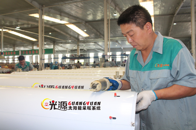 河北光源太陽(yáng)能科技有限公司員工在制桶生產(chǎn)線上加班加點(diǎn)趕制太陽(yáng)能采暖水箱。