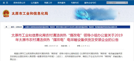 根據(jù)太原市工業(yè)和信息化局農(nóng)村清潔供熱“煤改電”領(lǐng)導(dǎo)小組辦公室制定的《太原市農(nóng)村清潔供熱“煤改電”電采暖設(shè)備供貨及安裝企業(yè)潛在投標(biāo)入圍資格一般要求和技術(shù)標(biāo)準(zhǔn)》(試行),經(jīng)專家委員會(huì)評(píng)審,確定河北光源太陽(yáng)能科技有限公司為2019年山西太原市“煤改電”采暖設(shè)備入圍企業(yè)。入圍產(chǎn)品為:蓄熱式電鍋爐、蓄熱式電暖器。
